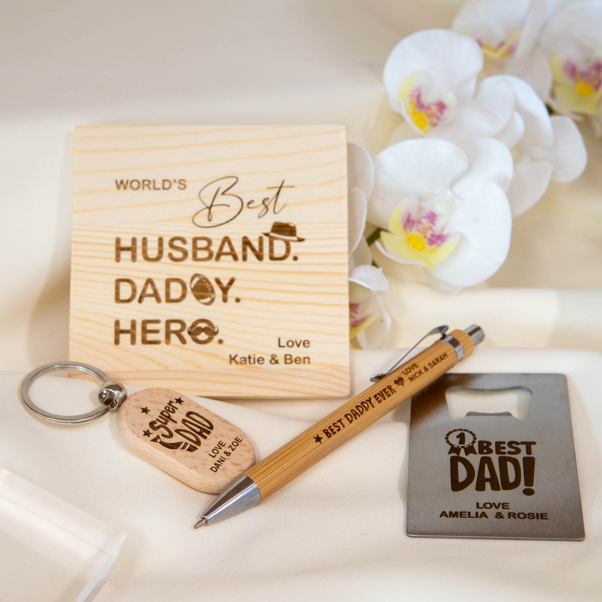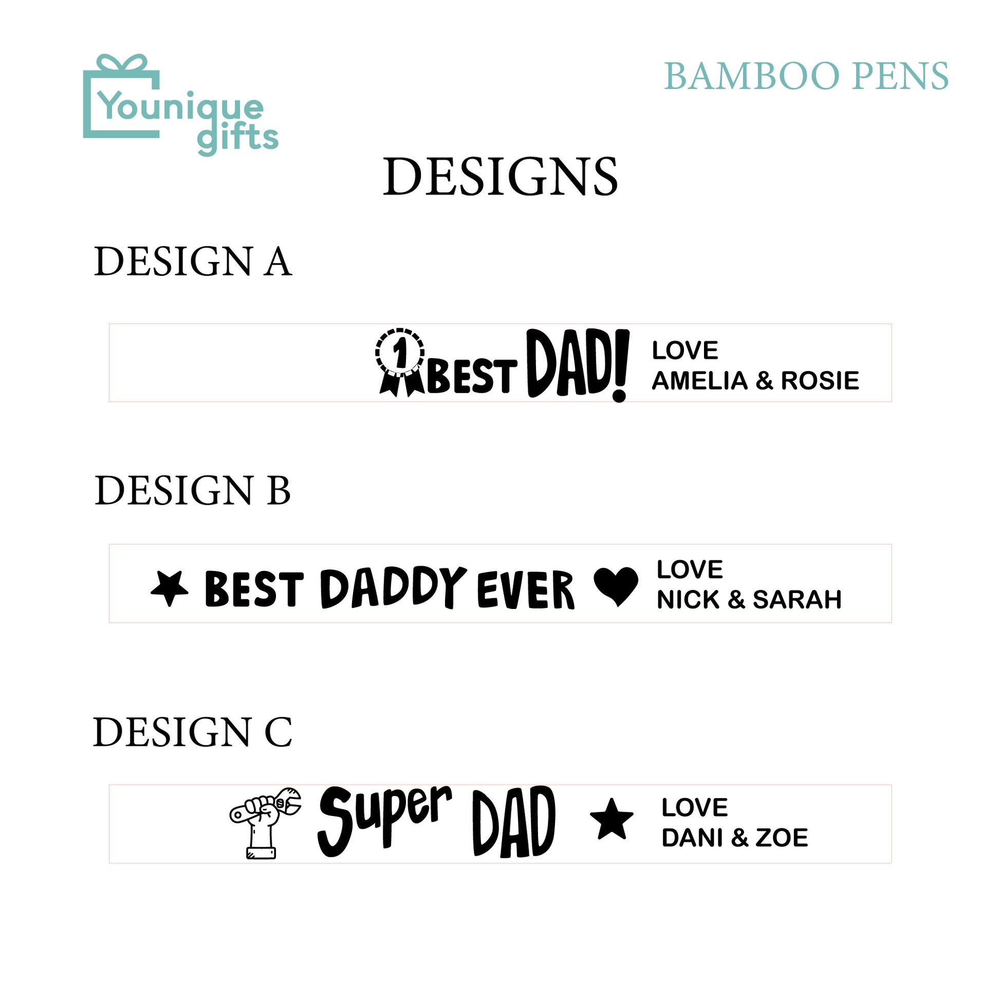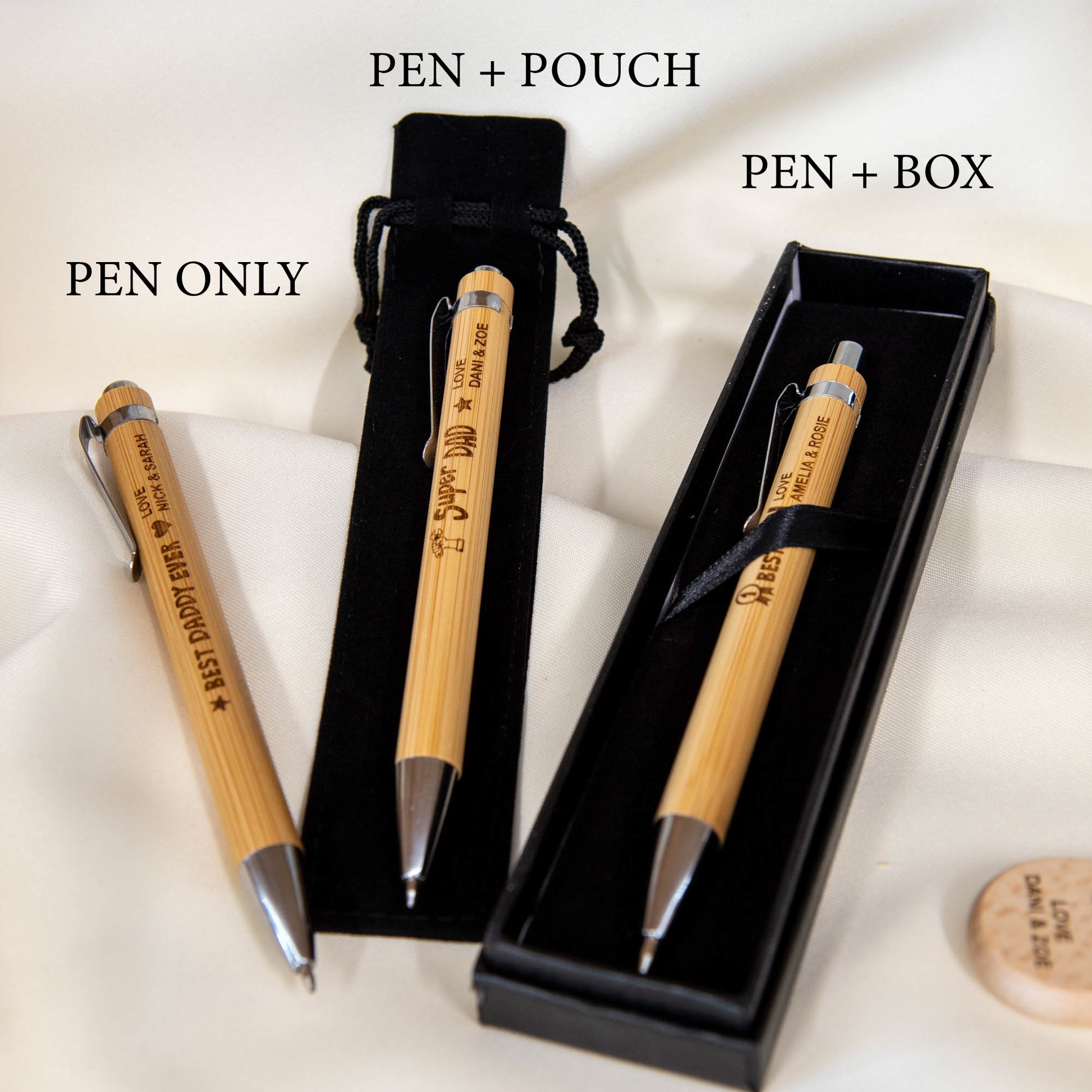 Crafted from sustainable bamboo, this elegant pen combines functionality with sentiment. Choose from popular messages like “#1 Best Daddy,” “Best Daddy Ever,” or “Super Dad” — each design is engraved with precision and can be customised with your name or your children's names for that extra personal touch.
